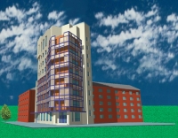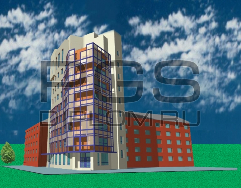 Запроектировано 9-ти этажное общественное здание с антресольным этажом - административно-деловой центр. Объект в основном включает в себя офисные помещения. На первом этаже находится кафе, имеется подвал. Данное сооружение имеет различную высоту. Высота этажа офисов - 3,3м, жилых комнат - 2,9.