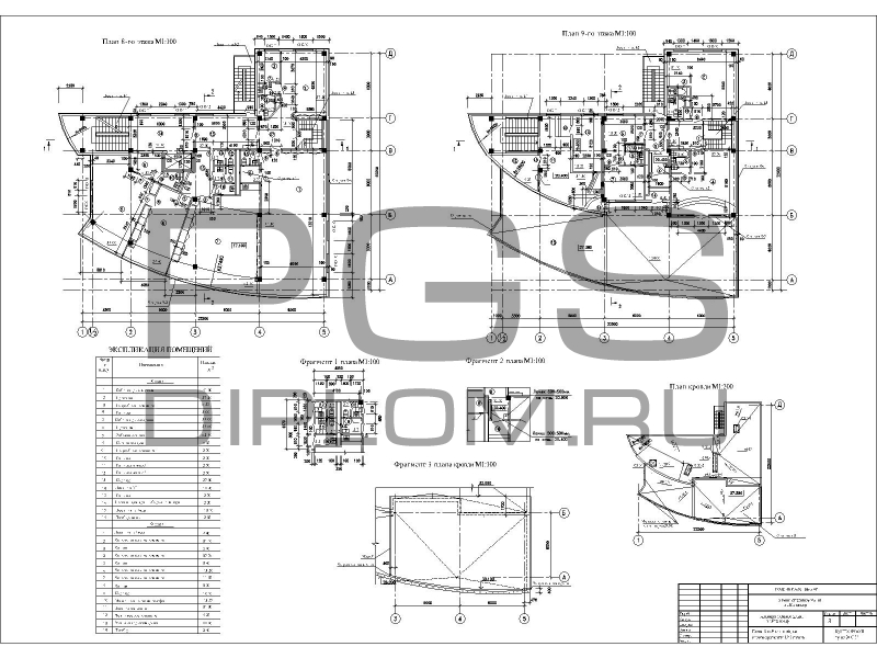 Здание представляет собой 9-этажное административное здание, со сложной конфигурации с размерами в осях 22,5х22,5м. Стена главного фасада в осях 1-5 выполнена в виде дуги с радиусом R=36,29м.